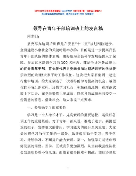 / 领导在青年干部培训班上的发言稿