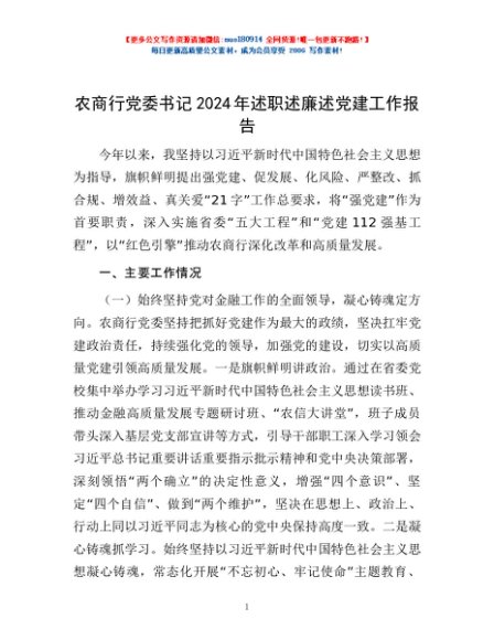 / 农商行党委书记2024年述职述廉述党建工作报告