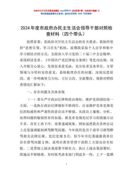 / 2024年度市政府办民主生活会领导干部对照检查材料(四个带头)
