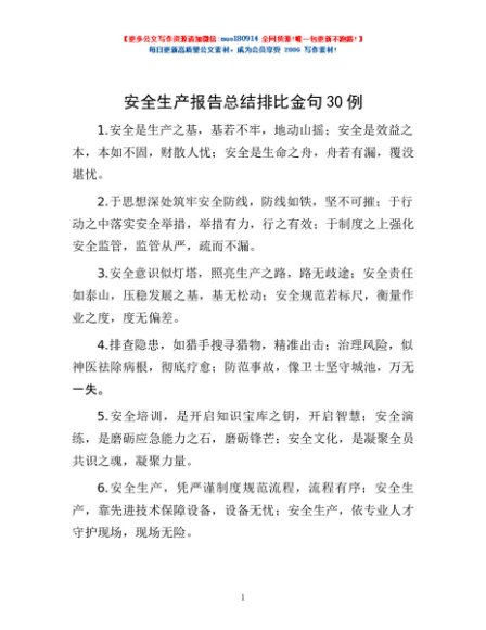 / 安全生产报告总结排比金句30例