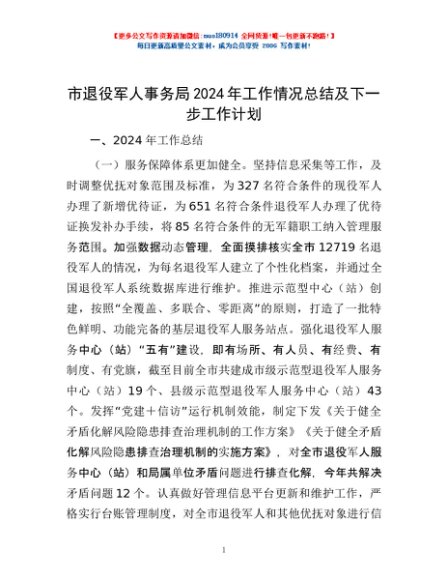 / 市退役军人事务局2024年工作情况总结及下一步工作计划