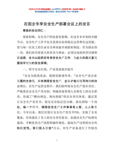 / 在国企冬季安全生产部署会议上的发言