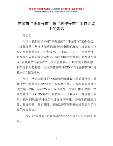 / 在某市“质量强市”暨“科技兴市”工作会议上的讲话