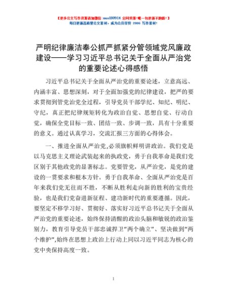 / 严明纪律 廉洁奉公 抓严抓紧分管领域党风廉政建设——学习习近平总书记关于全面从严治党的重要论述心得感悟