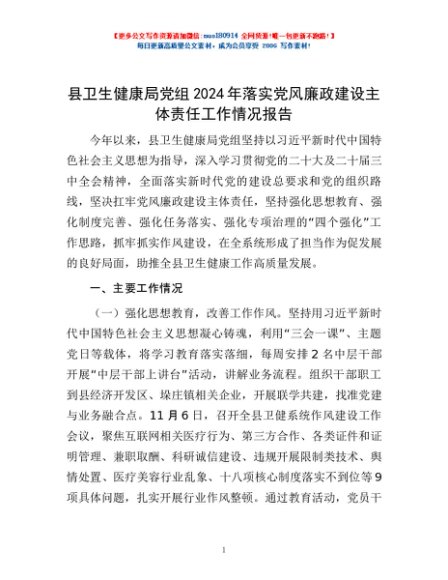 / 县卫生健康局党组2024年落实党风廉政建设主体责任工作情况报告