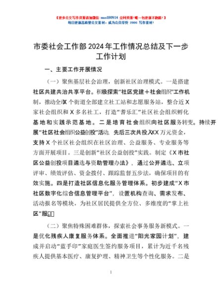 / 市委社会工作部2024年工作情况总结及下一步工作计划