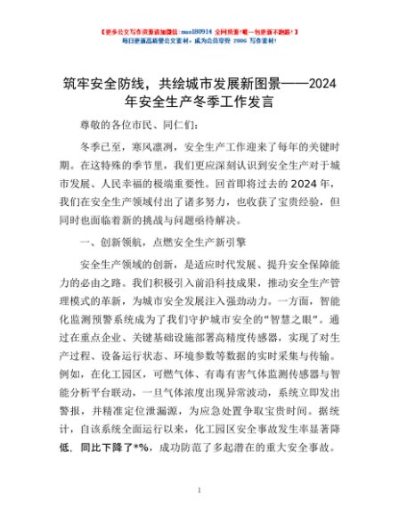 / 筑牢安全防线,共绘城市发展新图景——2024年安全生产冬季工作发言