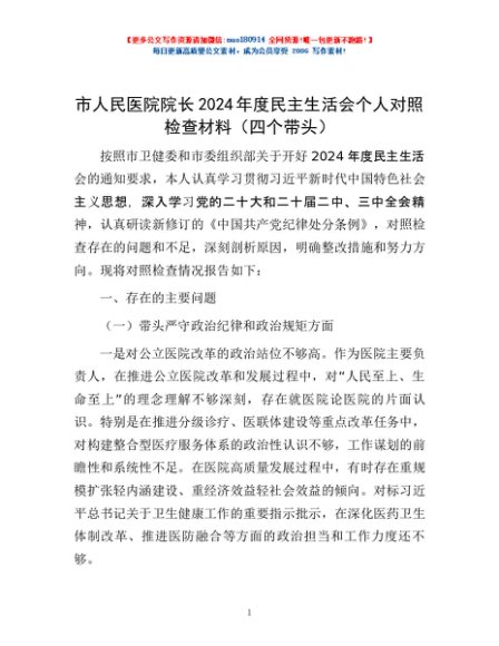 / 市人民医院院长2024年度民主生活会个人对照检查材料(四个带头)