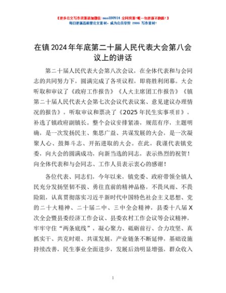 / 在镇2024年年底第二十届人民代表大会第八会议上的讲话