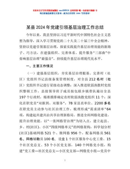 / 某县2024年党建引领基层治理工作总结