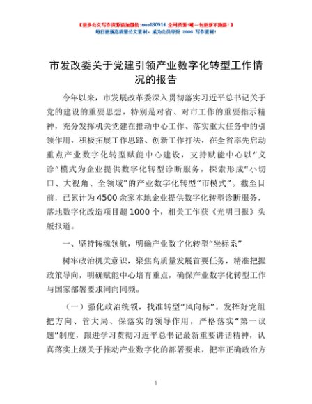 / 市发改委关于党建引领产业数字化转型工作情况的报告