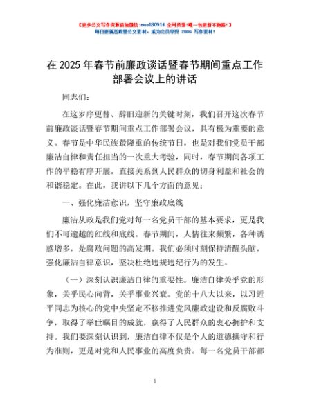 / 在 2025年春节前廉政谈话暨春节期间重点工作部署会议上的讲话