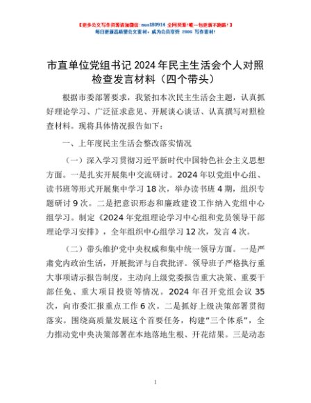 / 市直单位党组书记2024年民主生活会个人对照检查发言材料(四个带头)