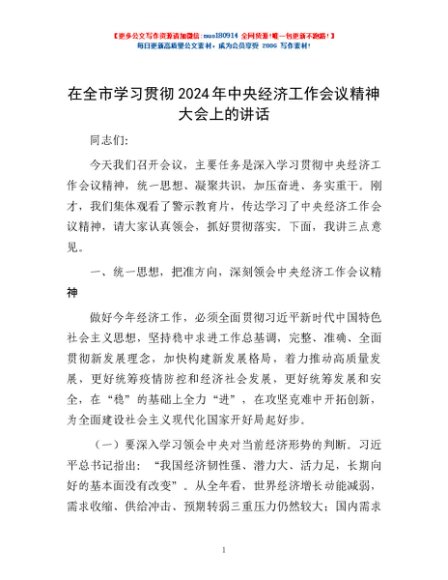 / 在全市学习贯彻2024年中央经济工作会议精神大会上的讲话