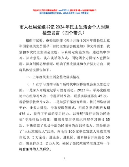 / 市人社局党组书记2024年民主生活会个人对照检查发言(四个带头)