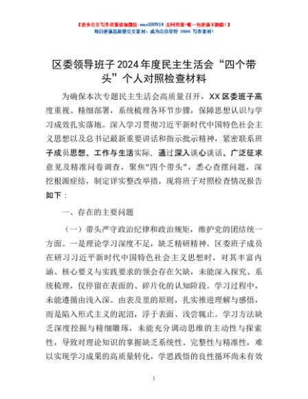 / 区委领导班子2024年度民主生活会“四个带头”个人对照检查材料