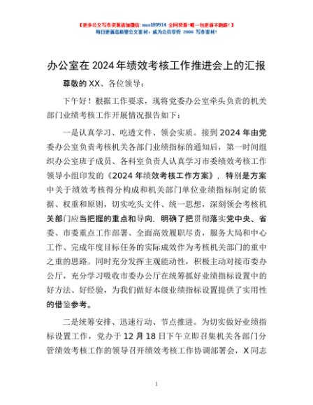 / 办公室在2024年绩效考核工作推进会上的汇报