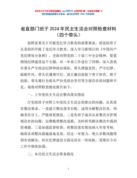/ 省直部门班子2024年民主生活会对照检查材料(四个带头)