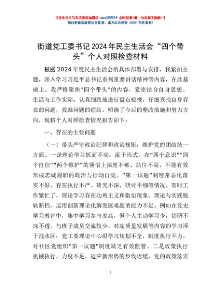 / 街道党工委书记2024年民主生活会“四个带头”个人对照检查材料