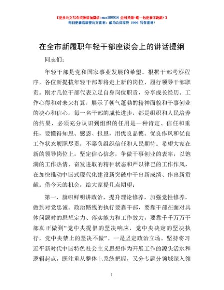 / 在全市新履职年轻干部座谈会上的讲话提纲