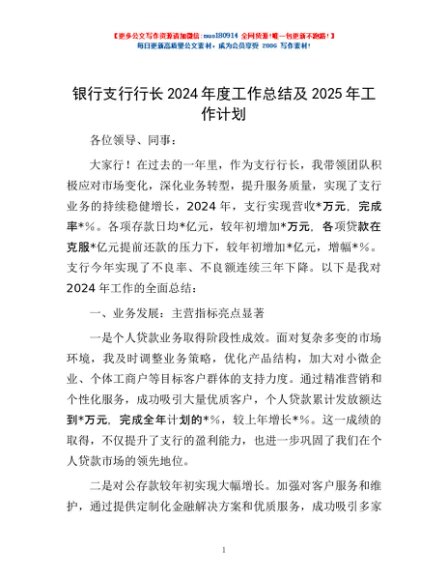 / 银行支行行长2024年度工作总结及2025年工作计划