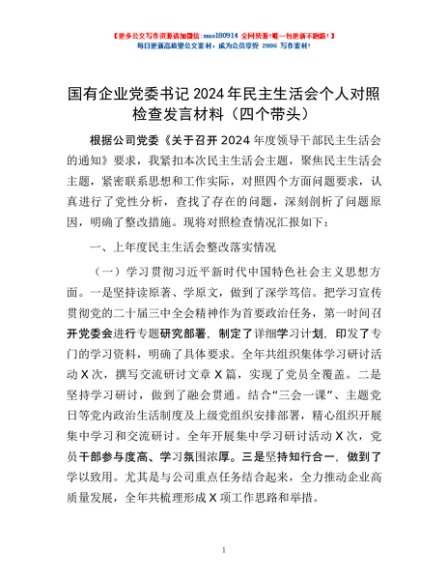 / 国有企业党委书记2024年民主生活会个人对照检查发言材料(四个带头)