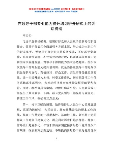 / 在领导干部专业能力提升培训班开班式上的讲话提纲