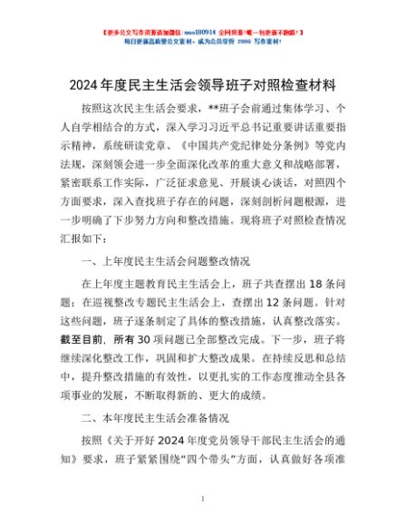 / 2024年度民主生活会领导班子对照检查材料