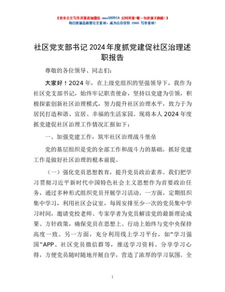 / 社区党支部书记 2024 年度抓党建促社区治理述职报告