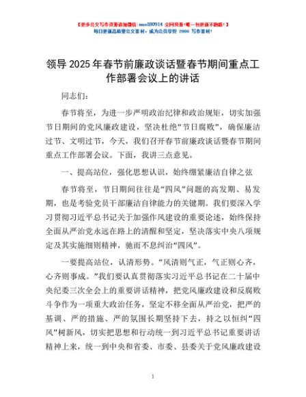/ 领导2025年春节前廉政谈话暨春节期间重点工作部署会议上的讲话