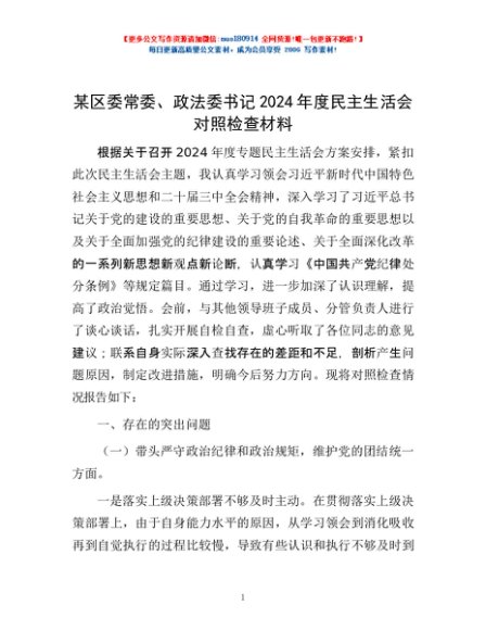 / 某区委常委、政法委书记2024年度民主生活会对照检查材料