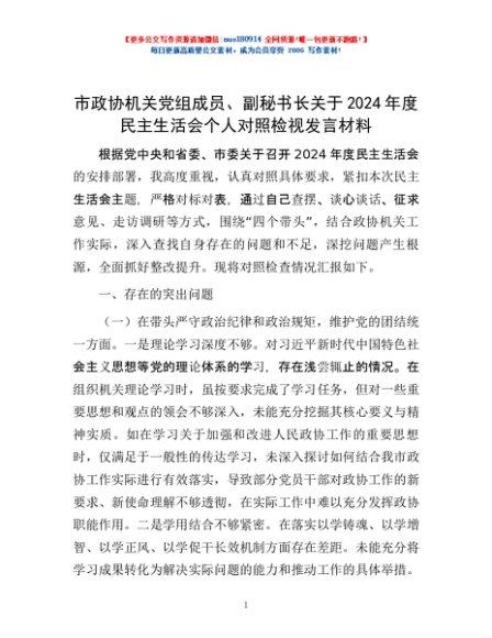 / 市政协机关党组成员、副秘书长关于2024年度民主生活会个人对照检视发言材料