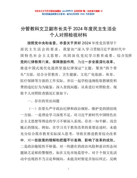 / 分管教科文卫副市长关于2024年度民主生活会个人对照检视材料