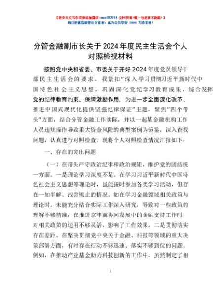 / 分管金融副市长关于2024年度民主生活会个人对照检视材料