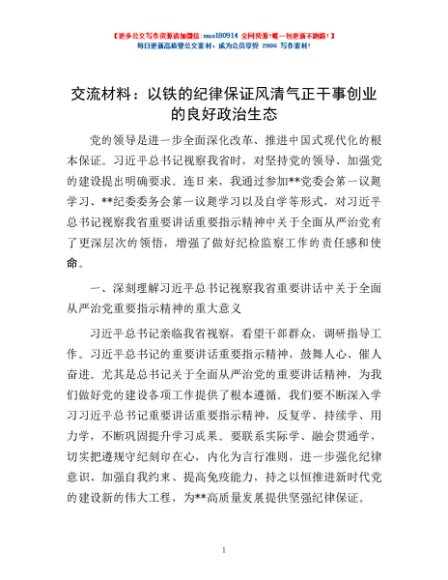 / 交流材料:以铁的纪律保证风清气正干事创业的良好政治生态
