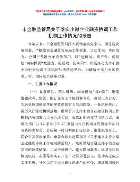 / 市金融监管局关于落实小微企业融资协调工作机制工作情况的报告