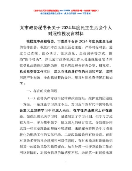 / 某市政协秘书长关于2024年度民主生活会个人对照检视发言材料
