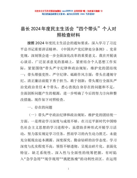 / 县长2024年度民主生活会“四个带头”个人对照检查材料