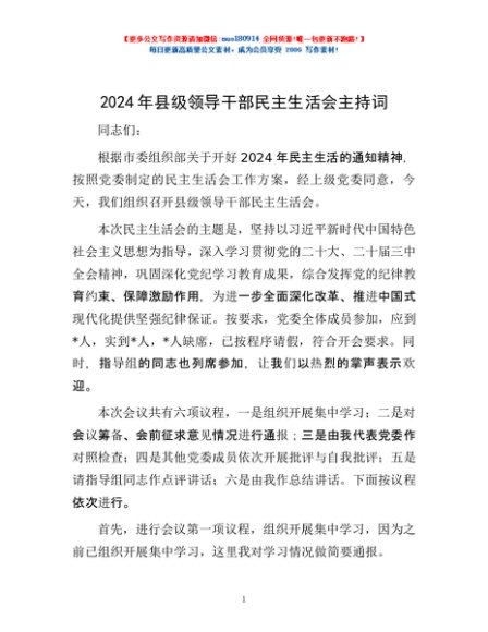 / 2024年县级领导干部民主生活会主持词