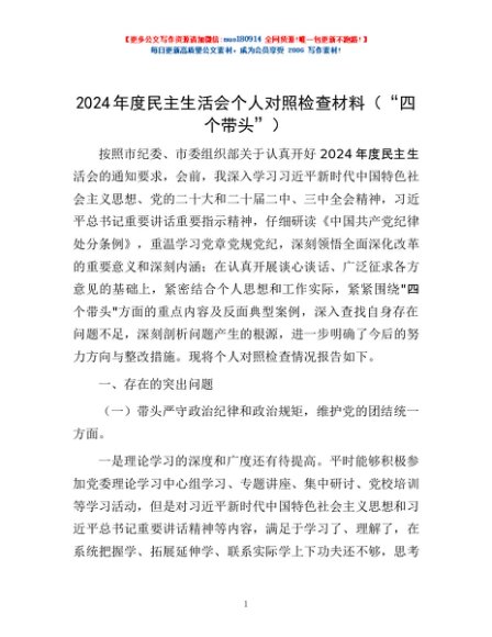 / 2024年度民主生活会个人对照检查材料(“四个带头”)