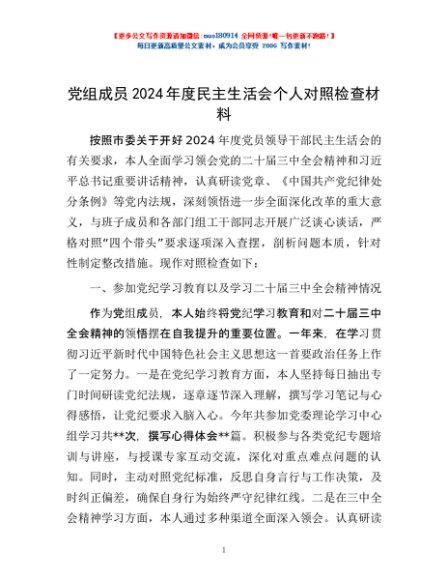 / 党组成员2024年度民主生活会个人对照检查材料