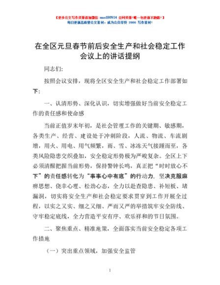 / 在全区元旦春节前后安全生产和社会稳定工作会议上的讲话提纲