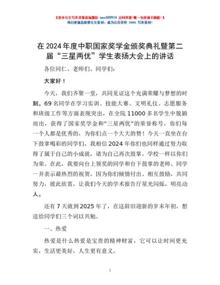 / 在2024年度中职国家奖学金颁奖典礼暨第二届“三星两优”学生表扬大会上的讲话