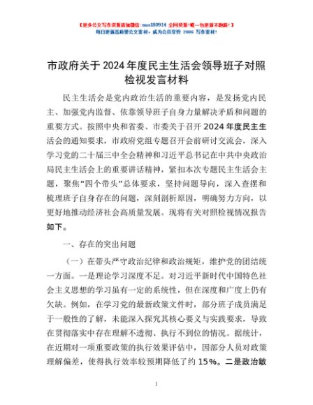 / 市政府关于2024年度民主生活会领导班子对照检视发言材料