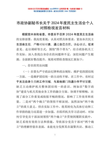 / 市政协副秘书长关于2024年度民主生活会个人对照检视发言材料