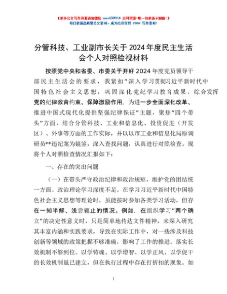 / 分管科技、工业副市长关于2024年度民主生活会个人对照检视材料