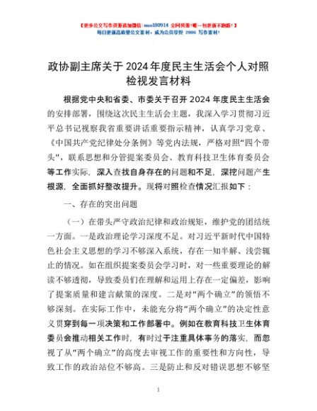 / 政协副主席关于2024年度民主生活会个人对照检视发言材料