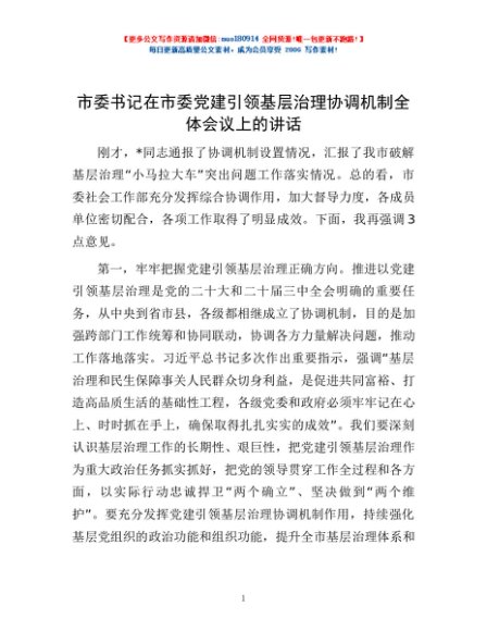 / 市委书记在市委党建引领基层治理协调机制全体会议上的讲话