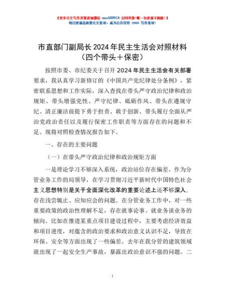 / 市直部门副局长2024年民主生活会对照材料(四个带头+保密)