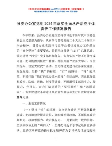 / 县委办公室党组2024年落实全面从严治党主体责任工作情况报告